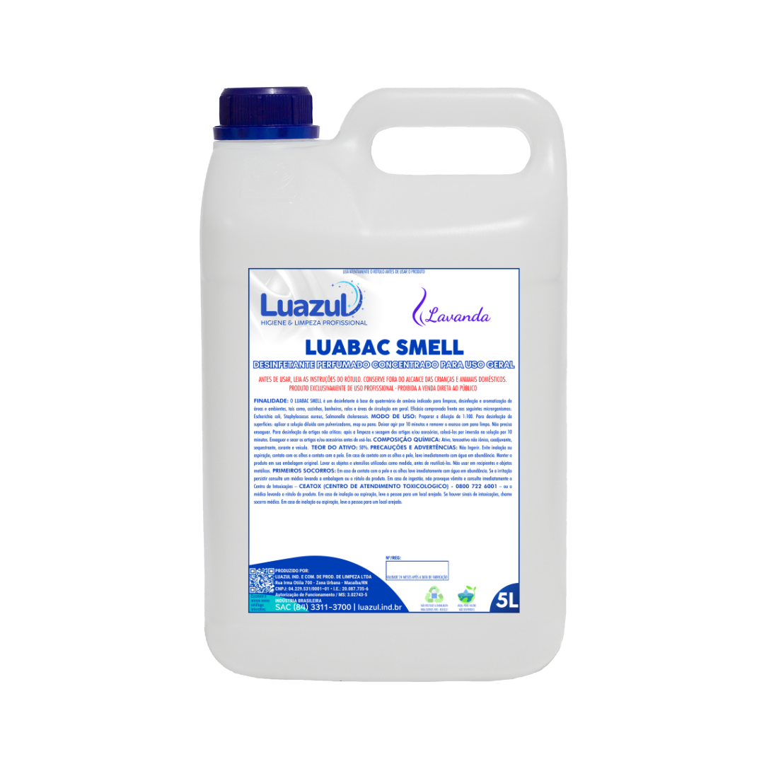 O LUABAC SMELL é um desinfetante perfumado concentrado à base de quaternário de amônio indicado para limpeza e desinfecção em áreas de circulação em geral. Limpa, perfuma e desinfeta. Pode ser utilizado em paredes, pisos, azulejos, janelas, escadas, banheiros, áreas externas e internas. Eficácia comprovada frente aos seguintes microrganismos: Escherichia coli, Staphylococcus aureus, Salmonella choleraesuis.
